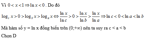 Cho 0 < x < 1; 0 < a;b;c ≠ 1 và logc x > 0 > logb x > loga x so sánh a; b; c ta được kết quả: