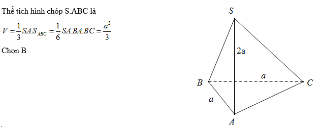 Cho khối chóp S.ABC có đáy ABC là tam giác vuông cân tại B, độ dài cạnh BA = BC = a, cạnh bên SA vuông góc với đáy và SA = 2a. Thể tích V của khối chóp S.ABC là: