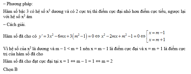 Tìm tất cả các giá trị thực của m để hàm số y = x3 – 3mx2 + 3(m2 – 1)x – 3m2 + 5 đạt cực đại tại x = 1. Ta có kết quả: