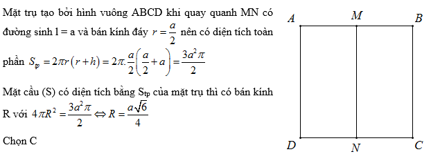 Cho hình vuông ABCD có cạnh bằng a. Gọi M, N lần lượt là trung điểm của AB và CD. Khi quay hình vuông ABCD quanh MN tạo thành một hình trụ. Gọi (S) là mặt cầu có diện tích bằng diện tích toàn phần của hình trụ, ta có bán kính của mặt cầu (S) là: