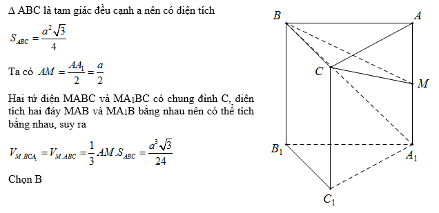 Cho khối lăng trụ tam giác đều ABC.A1B1C1 có tất cả các cạnh bằng a. Gọi M là trung điểm của AA1. Thể tích khối chóp M.BCA1 là: