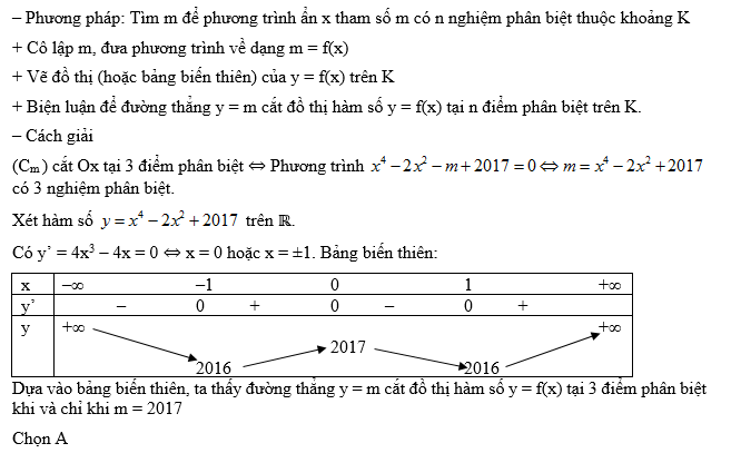 Gọi (Cm) là đồ thị hàm số y = x4 – 2x2 – m + 2017. Tìm m để (Cm) có đúng 3 điểm chung phân biệt với trục hoành, ta có kết quả: