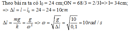 Một con lắc lò xo treo thẳng đứng có O là điểm trên cùng, M và N là 2 điểm trên lò xo sao cho khi chưa biến dạng chúng chia lò xo thành 3 phần bằng nhau có chiều dài mỗi phần là 8cm (ON > OM). Khi vật treo đi qua vị trí cân bằng thì đoạn ON = 68/3(cm). Gia tốc trọng trường g = 10m/s2. Tần số góc của dao động riêng này là