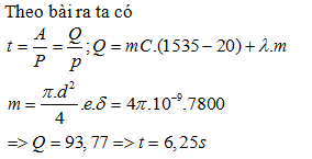 Người ta dùng một laze hoạt động dưới chế độ liên tục để khoan một tấm thép. Công suất chùm là P = 15 W. Đường kính của chùm sáng là d = 2 mm, bề dày tấm thép là e = 4 mm. Nhiệt độ ban đầu là 20(0C). Khối lượng riêng của thép là: ρ = 7800kg/m3; nhiệt dung riêng của thép là: c = 450 J/kg.độ; Nhiệt nóng chảy riêng của thép là 275 kJ/kg; điểm nóng chảy của thép là 1535(0C). Thời gian tối thiểu để khoan là: