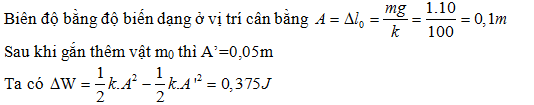 Con lắc lò xo thẳng đứng, lò xo có độ cứng k = 100N/m, vật nặng có khối lượng m = 1kg. Nâng vật lên cho lò xo có chiều dài tự nhiên rồi thả nhẹ để con lắc dao động. Bỏ qua mọi lực cản. Khi vật m tới vị trí thấp nhất thì nó tự động được gắn thêm vật m0 = 500g một cách nhẹ nhàng. Chọn gốc thế năng là vị trí cân bằng. Lấy g = 10m/s2. Hỏi năng lượng dao động của hệ thay đổi một lượng bằng bao nhiêu?