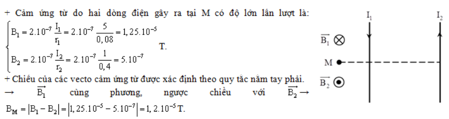 Hai dây dẫn thẳng, dài song song cách nhau 32 (cm) trong không khí, dòng điện chạy trên dây 1 là I1 = 5 (A), dòng điện chạy trên dây 2 là I2 = 1 (A) ngược chiều với I1. Điểm M nằm trong mặt phẳng của 2 dòng điện ngoài khoảng hai dòng điện và cách dòng điện I1 8 (cm). Cảm ứng từ tại M có độ lớn là: