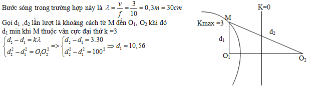 Trên bề mặt chất lỏng có hai nguồn phát sóng kết hợp O1, O2 dao động đồng pha, cách nhau một khoảng O1O2 = 100cm. Biết sóng do mỗi nguồn phát ra có tần số 10Hz, vận tốc truyền sóng là 3m/s. Xét điểm M nằm trên đường thẳng vuông góc với O1O2 tại O1. Đoạn O1M có giá trị nhỏ nhất bằng bao nhiêu để tại M có dao động với biên độ cực đại?