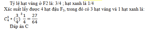 Ở đậu Hà lan, biết A ( hạt vàng) trội hoàn toàn so với a(hạt xanh). Cho PTC: hạt vàng x hạt xanh được F1 100% hạt vàng. Cho F1 tự thụ phấn thu được F2, xác suất lấy được 4 hạt đậu F2, trong đó có 3 hạt vàng và 1 hạt xanh là bao nhiêu?