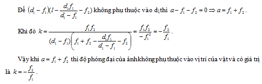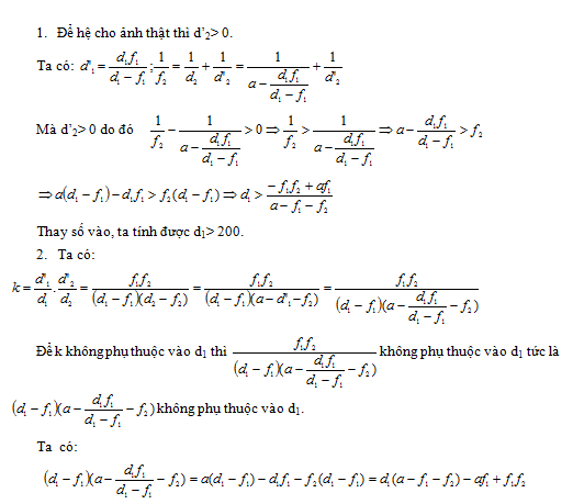 Để hệ cho ảnh thật thì vật phải đặt trong khoảng nào? Thay đổi khoảng cách a giữa hai thấu kính. Tìm điều kiện khoảng cách a giữa hai thấu kính để độ phóng đại của hệ không phụ thuộc vào vị trí đặt vật.