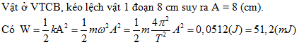 Con lắc lò xo gồm lò xo nhẹ độ gắn với vật nhỏ khối lượng 400g. Kéo vật lệch khỏi vị trí cân bằng đoạn 8cm dọc theo trục lò xo rồi thả nhẹ thì thấy vật dao động điều hòa với chu kì 1s. Lấy