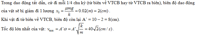 Một con lắc lò xo gồm vật nhỏ khối lượng 0,02 kg và lò xo có độ cứng 1 N/m. Vật nhỏ được đặt trên giá đỡ cố định nằm ngang dọc theo trục lò xo. Hệ số ma sát trượt giữa giá đỡ và vật nhỏ là 0,1. Ban đầu giữ vật ở vị trí lò xo bị nén 10 cm rồi buông nhẹ để con lắc dao động tắt dần. Lấy g = 10 m/s2. Tốc độ lớn nhất vật nhỏ đạt được trong quá trình dao động là: