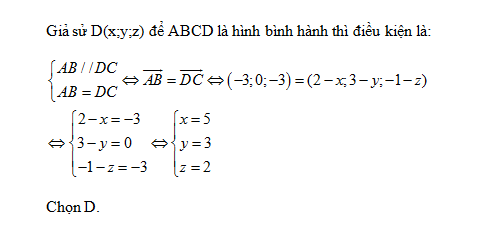 Tam giác ABC, biết A(5;3;-1); B(2;3;-4); C(2;3;-1). Tìm toạ độ điểm D để ABCD là hình bình