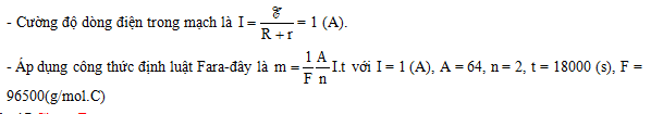 Một bình điện phân dung dịch CuSO4 có anốt làm bằng đồng, điện trở của bình điện phân \(R = 8(\Omega )\), được mắc vào hai cực của bộ nguồn E = 9 (V), điện trở trong \(r = 1(\Omega )\). Khối lượng Cu bám vào catốt trong thời gian 5 h có giá trị là: