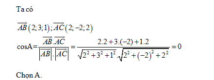 Cho tam giác ABC có điểm A(1;2;3) B(3;5;4) C(3;0;5). Khi đó góc A bằng: