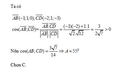 Cho tứ diện ABCD có A(1;0;0) B(0;1;0) C(0;0;1) D(-2;1;-2). Khi đó góc tạo bởi hai cạnh đối diện AB và CD.