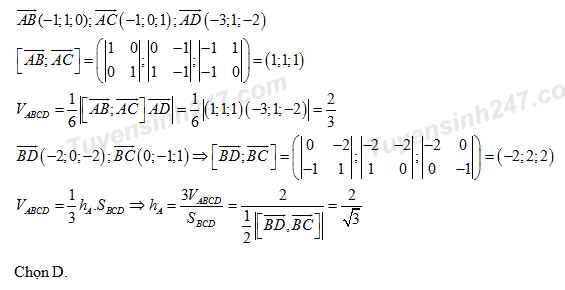 Cho tứ diện ABCD có A(1;0;0) B(0;1;0) C(0;0;1) D(-2;1;-2). Khi đó độ dài đường cao của tứ diện kẻ từ đỉnh A bằng: