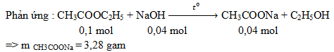 Thuỷ phân 8,8 gam etyl axetat bằng 200 ml dung dịch NaOH 0,2M. Sau khi phản ứng xảy ra hoàn toàn, cô