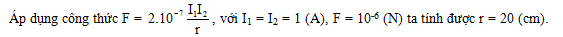 Hai dây dẫn thẳng, dài song song đặt trong không khí. Dòng điện chạy trong hai dây có cùng cường độ 1 (A). Lực từ tác dụng lên mỗi mét chiều dài của mỗi dây có độ lớn là 10-6(N). Khoảng cách giữa hai dây đó là:
