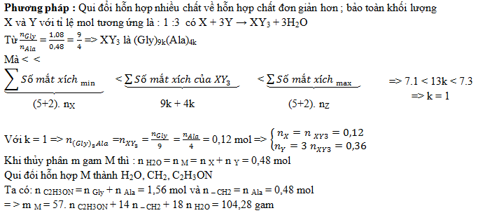 Hỗn hợp M gồm một peptit X và một peptit Y đều mạch hở (chúng được cấu tạo từ 1 loại amino axit, tổng số nhóm –CO–NH– trong 2 phân tử là 5) với tỉ lệ số mol nX : nY = 1 : 3. Khi thủy phân hoàn toàn m gam M thu được 81 gam glyxin và 42,72 gam alanin. Giá trị của m là