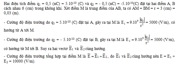 Hai điện tích điểm q1 = 0,5 (nC) và q2 = - 0,5 (nC) đặt tại hai điểm A, B cách nhau 6 (cm) trong