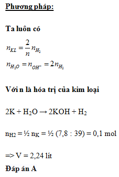 Lấy 7,8 gam kali tác dụng hoàn toàn với nước thu được V lít khí (đktc). Giá trị của V là: