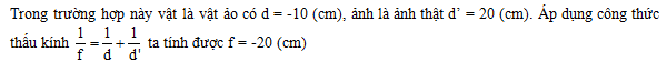 Chiếu một chùm sáng hội tụ qua một lỗ tròn trên một màn chắn sáng, thấy chùm sáng hội tụ tại một điểm trên đường thẳng vuông góc với mặt phẳng của lỗ và đi qua tâm lỗ tròn, cách tâm lỗ tròn một khoảng 10 (cm). Đặt vào lỗ tròn một thấu kính phân kì thì thấy chùm sáng hội tụ tại một điểm cách tâm lỗ tròn một khoảng 20 (cm). Tiêu cự của thấu kính là: