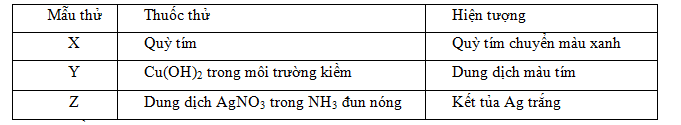 Kết quả thí nghiệm của các dung dịch X, Y, Z với thuốc thử được ghi ở bảng sau: