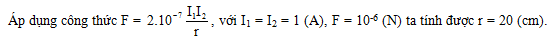 Hai dây dẫn thẳng, dài song song đặt trong không khí. Dòng điện chạy trong hai dây có cùng cường độ 1 (A). Lực từ tác dụng lên mỗi mét chiều dài của mỗi dây có độ lớn là 10-6(N). Khoảng cách giữa hai dây đó là: