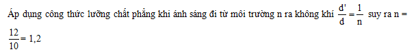 Một điểm sáng S nằm trong chất lỏng (chiết suất n), cách mặt chất lỏng một khoảng 12 (cm), phát ra chùm sáng hẹp đến gặp mặt phân cách tại điểm I với góc tới rất nhỏ, tia ló truyền theo phương IR. Đặt mắt trên phương IR nhìn thấy ảnh ảo S’ của S dường như cách mặt chất lỏng một khoảng 10 (cm). Chiết suất của chất lỏng đó là