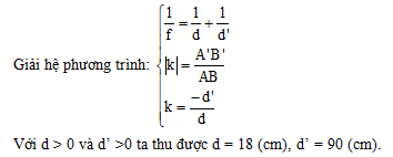 Vật sáng AB qua thấu kính hội tụ có tiêu cự f = 15 (cm) cho ảnh thật A’B’ cao gấp 5 lần