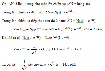 Trong điều trị bệnh ung thư, bệnh nhân được chiếu xạ với một lều xác định nào đó từ một nguồn phóng xạ. Biết nguồn có chu kỳ bán rã là 4 năm. Khi nguồn được sử dụng lần đầu thì thời gian cho 1 liều xạ là 10 phút. Hỏi sau hai năm thời gian cho 1 liều xạ là bao nhiêu phút
