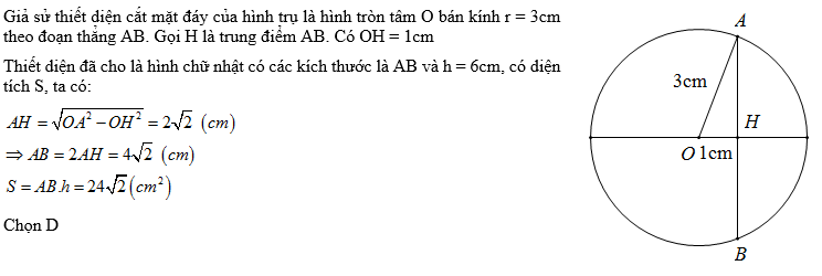 Xét khối trụ được tạo thành bởi hình trụ tròn xoay có bán kính đáy r=3cm, khoảng cách giữa hai đáy bằng 6cm. Cắt khối trụ đó bởi mặt phẳng song song với trục và cách trục 1cm. Diện tích của thiết diện được tạo nên là :