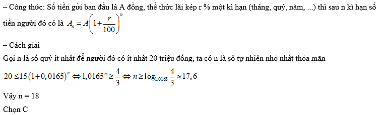 Một người gửi 15 triệu đồng vào ngân hàng theo thể thức lãi kép kì hạn 1 quý, với lãi suất 1,65% một quý. Hỏi sao bao lâu người gửi có ít nhất 20 triệu đồng (bao gồm cả vốn lẫn lãi) từ số vốn ban đầu ? (Giả sử lãi suất không thay đổi)