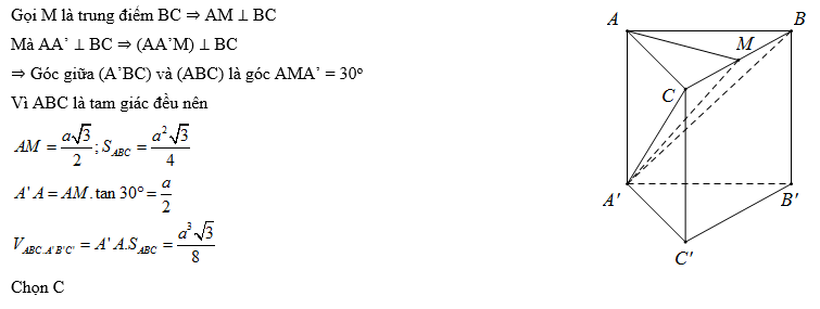 Cho lăng trụ tam giác đều ABC.A’B’C’, cạnh đáy bằng a. Cho góc hợp bởi (A’BC) và mặt đáy là 300. Thể tích khối lăng trụ ABC.A’B’C’ là
