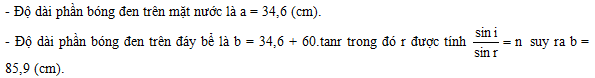 Một bể chứa nước có thành cao 80 (cm) và đáy phẳng dài 120 (cm) và độ cao mực nước trong bể là 60 (cm), chiết suất của nước là 4/3. Ánh nắng chiếu theo phương nghiêng góc 300 so với phương ngang. Độ dài bóng đen tạo thành trên đáy bể là: