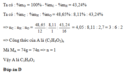 hợp chất hữu cơ A gồm 3 nguyên tố C, H, O trong đó %mC = 48,65 %, %mH= 8,11%. Biết khối lượng mol phân tử của A là 74. Xác định CTPT của A
