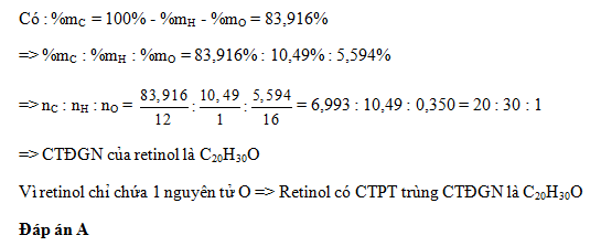 Vitamin A là một chất dinh dưỡng thiết yếu cho con người. Trong thực phẩm, vitamin A tồn tại ở dạng chính là retinol (chứa C, H, O) trong đó thành phần % khối lượng H và O tương ứng là 10,49% và 5,594%. Biết renitol chứa một nguyên tử O. CTPT của retinol là: