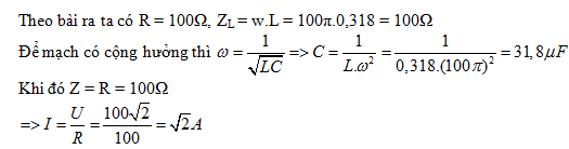 Cho mạch điện không phân nhánh. R = 100W, cuộn dây có độ tự cảm L = 0,318 H; f = 50Hz, tụ điện có điện dung thay đổi. Đặt vào hai đầu đoạn mạch một điện áp xoay chiều có giá trị hiệu dụng