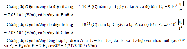 Hai điện tích q1 = q2 = 5.10-16 (C), đặt tại hai đỉnh B và C của một tam giác đều ABC cạnh