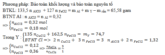 Cho 8,64 gam Al vào dung dịch X (được tạo thành bằng cách hòa tan 74,7 gam hỗn hợp Y gồm CuCl2 và FeCl3 vào nước). Kết thúc phản ứng, thu được 17,76 gam chất rắn gồm hai kim loại. Tỉ lệ số mol FeCl3 : CuCl2 trong hỗn hợp Y là :