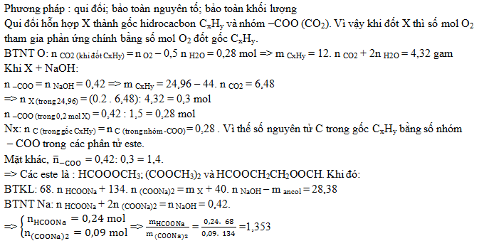 Hỗn hợp X chứa 3 este mạch hở, trong phân tử chỉ chứa một loại nhóm chức và được tạo bảo từ các axit cacboxylic có mạch không phân nhánh. Đốt cháy hế 0,2 mol X cần dùng 0,52 mol O2, thu được 0,48 mol H2O. Đun nóng 24,96 gam X cần dùng 560 ml dung dịch NaOH 0,75 M thu được hỗn hợp Y chứa các ancol có tổng khối lượng là 13,38 gam và hỗn hợp Z gồm hai muối, trong đó có a gam muối A và b gam muối B (MA < MB). Tỉ lệ gần nhất a: b là: