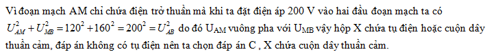 Cho đoạn mạch AB gồm hai đoạn AM và MB mắc nối tiếp. Đoạn AM chứa điện trở thuần, đoạn MB chứa hộp kín X (X chứa một trong ba phần tử: điện trở thuần, cuộn dây thuần cảm, tụ điện). Đặt vào A, B một điện áp xoay chiều có giá trị hiệu dụng 200