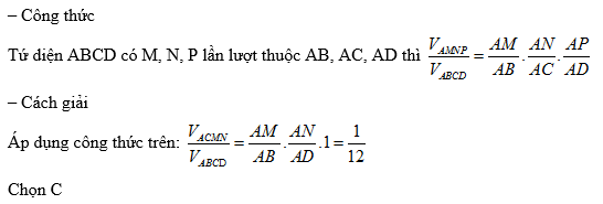 Cho tứ diện ABCD, hai điểm M và N lần lượt trên hai cạnh AB và AD sao cho \(\frac{{AM}}{{AB}} = \frac{1}{3};\frac{{AN}}{{AD}} = \frac{1}{4}\), khi đó tỉ số \(\frac{{{V_{ACMN}}}}{{{V_{ABCD}}}}\) bằng