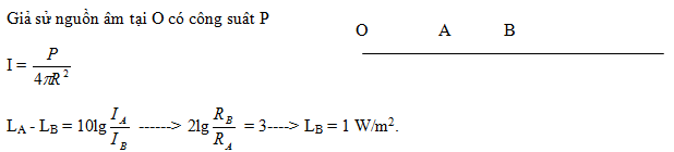 Trong môi trường không hấp thụ âm có một nguồn điểm O phát sóng âm đẳng hướng. Điểm A cách nguồn 1 m có cường độ âm 4 W/m2. Cường độ âm tại B cách nguồn 2 m là