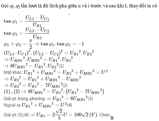 vào hai đầu đoạn mạch AB gồm đoạn AM và MB mắc nối tiếp. Đoạn mạch AM chứa điện trở thuần R không đổi, đoạn mạch MB chứa cuộn cảm thuần có độ tự cảm L không đổi và tụ điện có điện dung C thay đổi được mắc nối tiếp. Ban đầu điện áp hiệu dụng ở hai đầu đoạn mạch AM bằng U1 và điện áp hiệu dụng ở hai đầu đoạn MB là U2. Thay đổi điện dung C của tụ điện đến một giá trị xác định thì thấy điện áp hiệu dụng ở hai đầu đoạn MB bằng 2