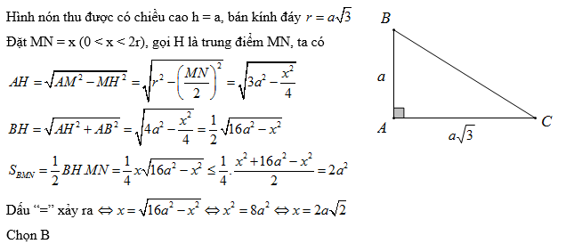 . Quay tam giác ABC quanh cạnh AB ta được hình nón đỉnh B . Một mặt phẳng (P) thay đổi luôn đi qua đỉnh B và cắt đường tròn đáy tại hai điểm M, N . Diện tích tam giác BMN lớn nhất là