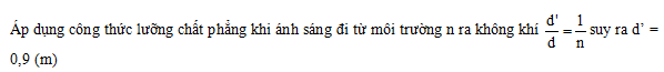 Cho chiết suất của nước n = 4/3. Một người nhìn một hòn sỏi nhỏ S mằn ở đáy một bể nước sâu 1,2 (m) theo phương gần vuông góc với mặt nước, thấy ảnh S’ nằm cách mặt nước một khoảng bằng