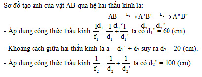 Cho hai thấu kính hội tụ L1, L2 có tiêu cự lần lượt là 20 (cm) và 25 (cm), đặt đồng trục và