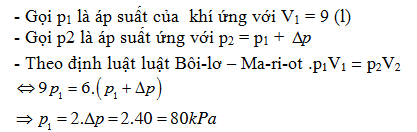 Nén khí đẳng nhiệt từ thể tích 9(l) đến thể tích 6 (l) thì thấy áp suất tăng lên một lượng