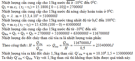 b/ Với lượng củi than 1,5kg, có thể thực hiện quá trình trên được không? Biết hiệu suất của bếp là 50%, năng suất tỏa nhiệt của than củi là 10.106J/kg.